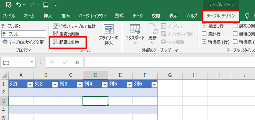 これでテーブルが通常の範囲に変換され、行や列のグループ化が使用できるようになります。