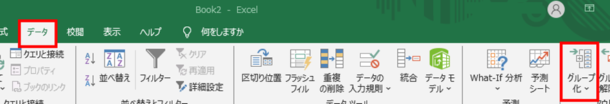 「データ」タブをクリックして、「アウトライン」グループ内の「グループ化」ボタンをクリックします。
