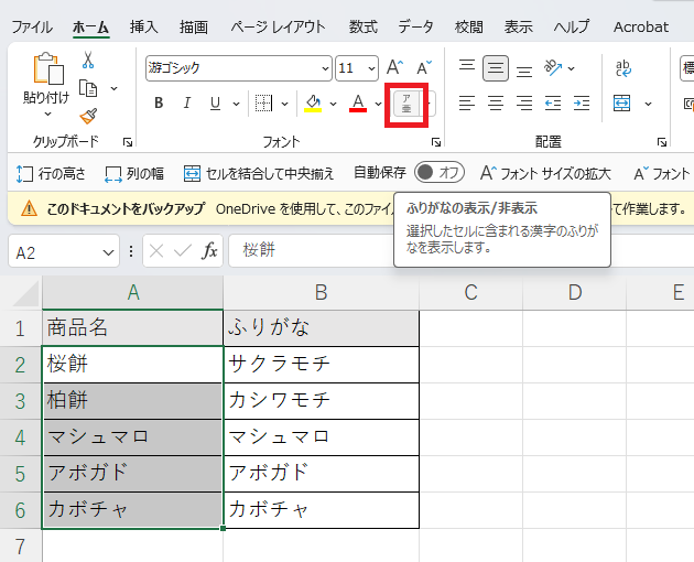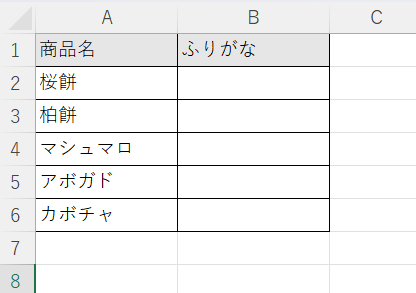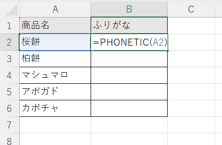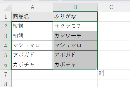 A列のデータをキーボードから直接入力していれば、桜餅には「サクラモチ」、柏餅には「カシワモチ」のようにふりがなが自動で表示されます。