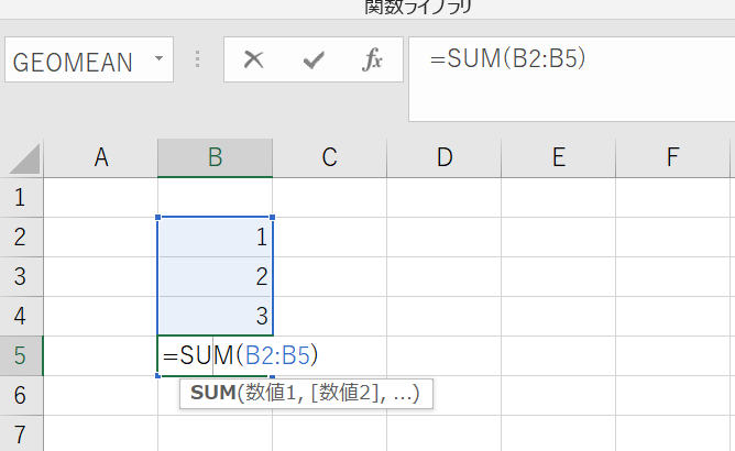 上の例ではB5セルにSUM関数が入力されており、この引数内に自身のB5セルも含めてしまっているのがわかるでしょう。