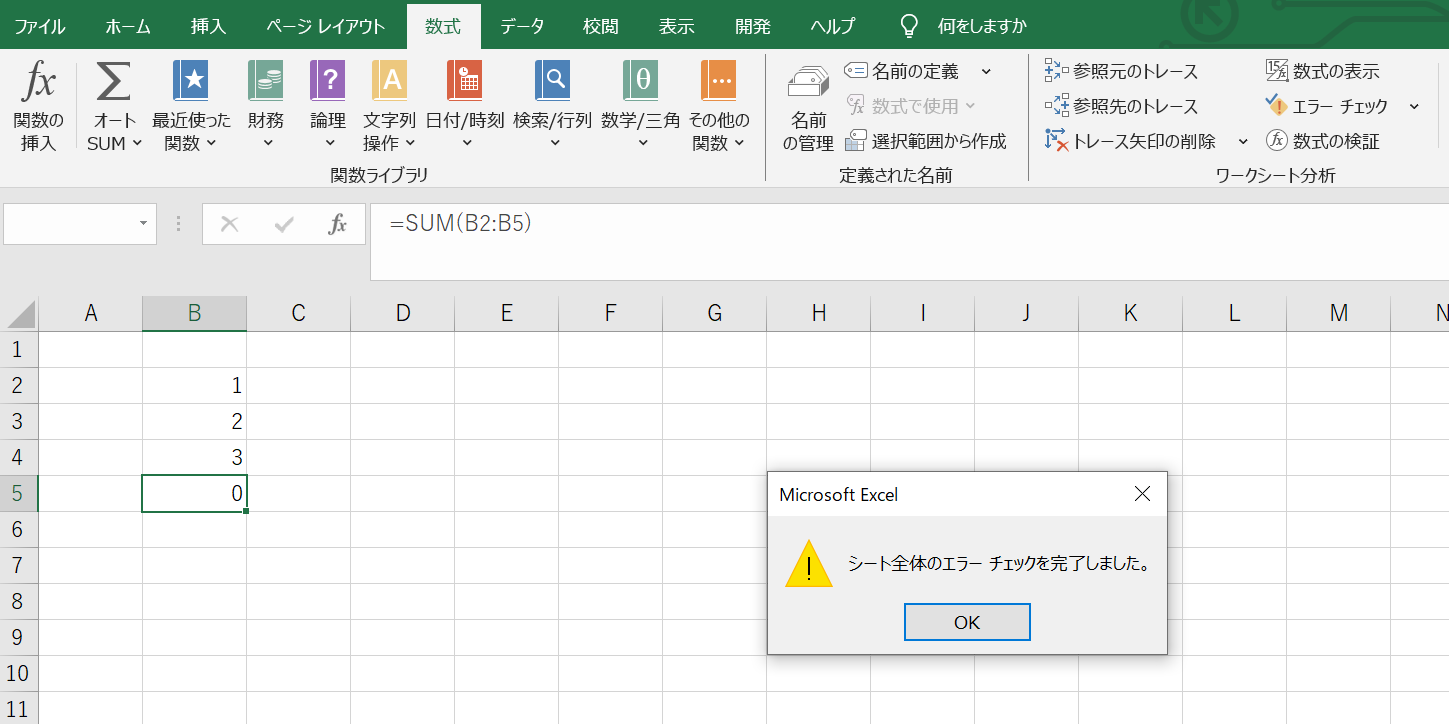 ボタンを押すと「シート全体のエラーチェックが完了しました」のウィンドウが表示されますのでOKとしましょう。