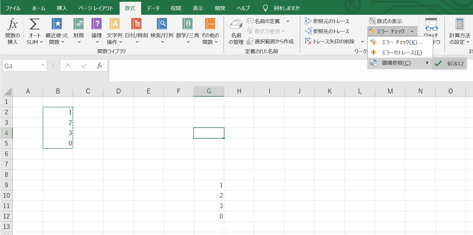 以下の例ではG12が最初の循環参照と特定できました。複数あっても1つずつしか確認できないので注意しましょう。