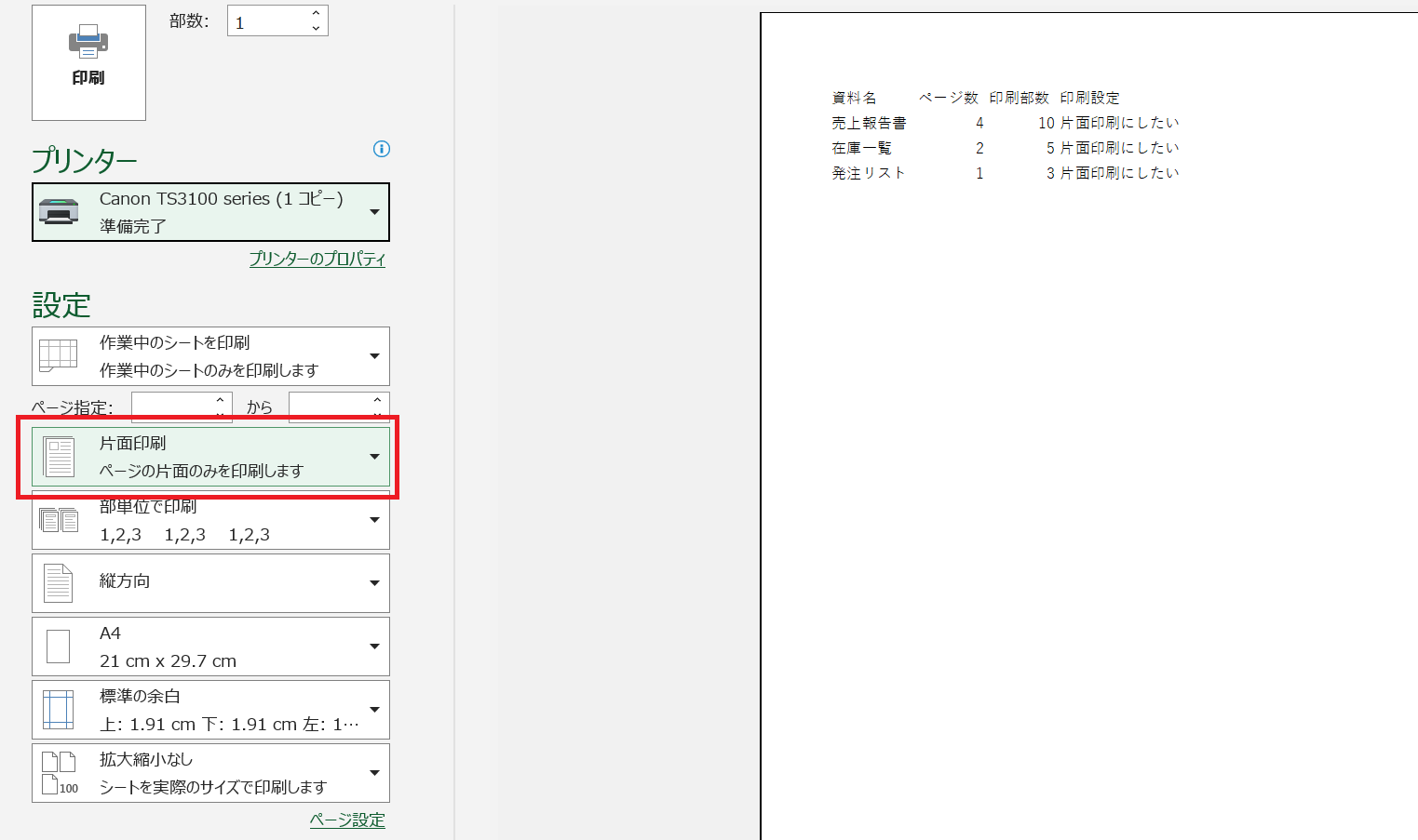 「片面印刷」に変更後、印刷プレビューで設定が反映されていることを確認してから印刷を実行しましょう。