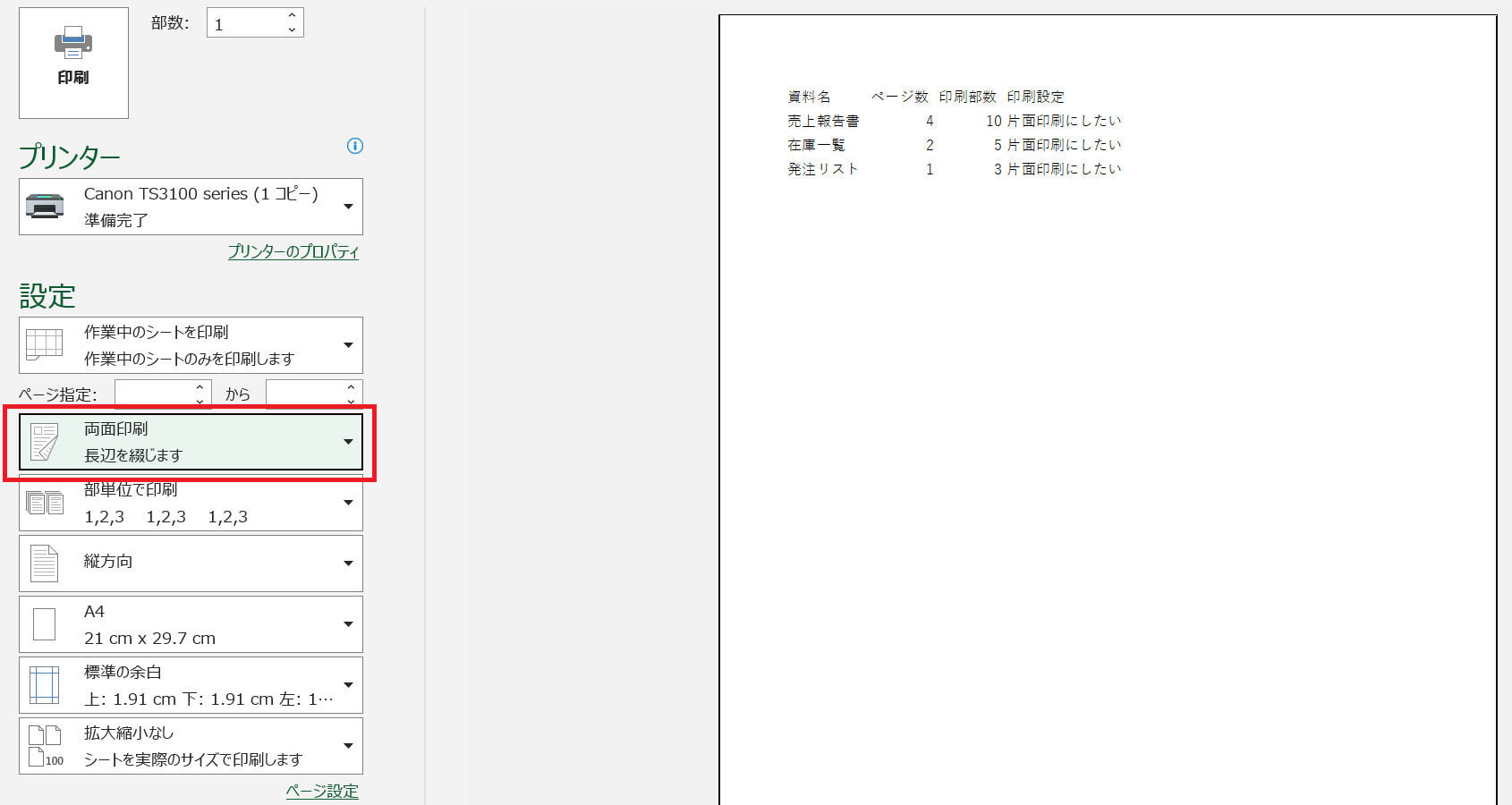 片面印刷にならない場合、まず最初に確認すべきなのがエクセルの印刷設定画面で両面印刷が選択されていることです。