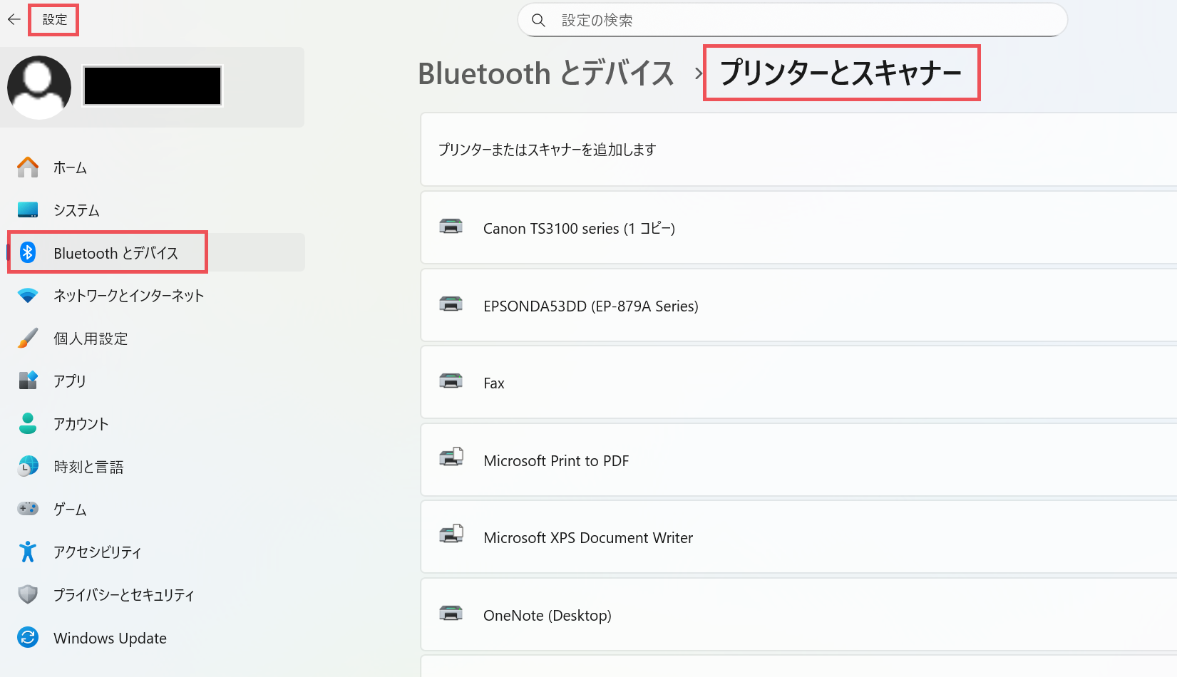Windowsの「スタート」メニューから「設定」→「デバイス」→「プリンターとスキャナー」を開きます。