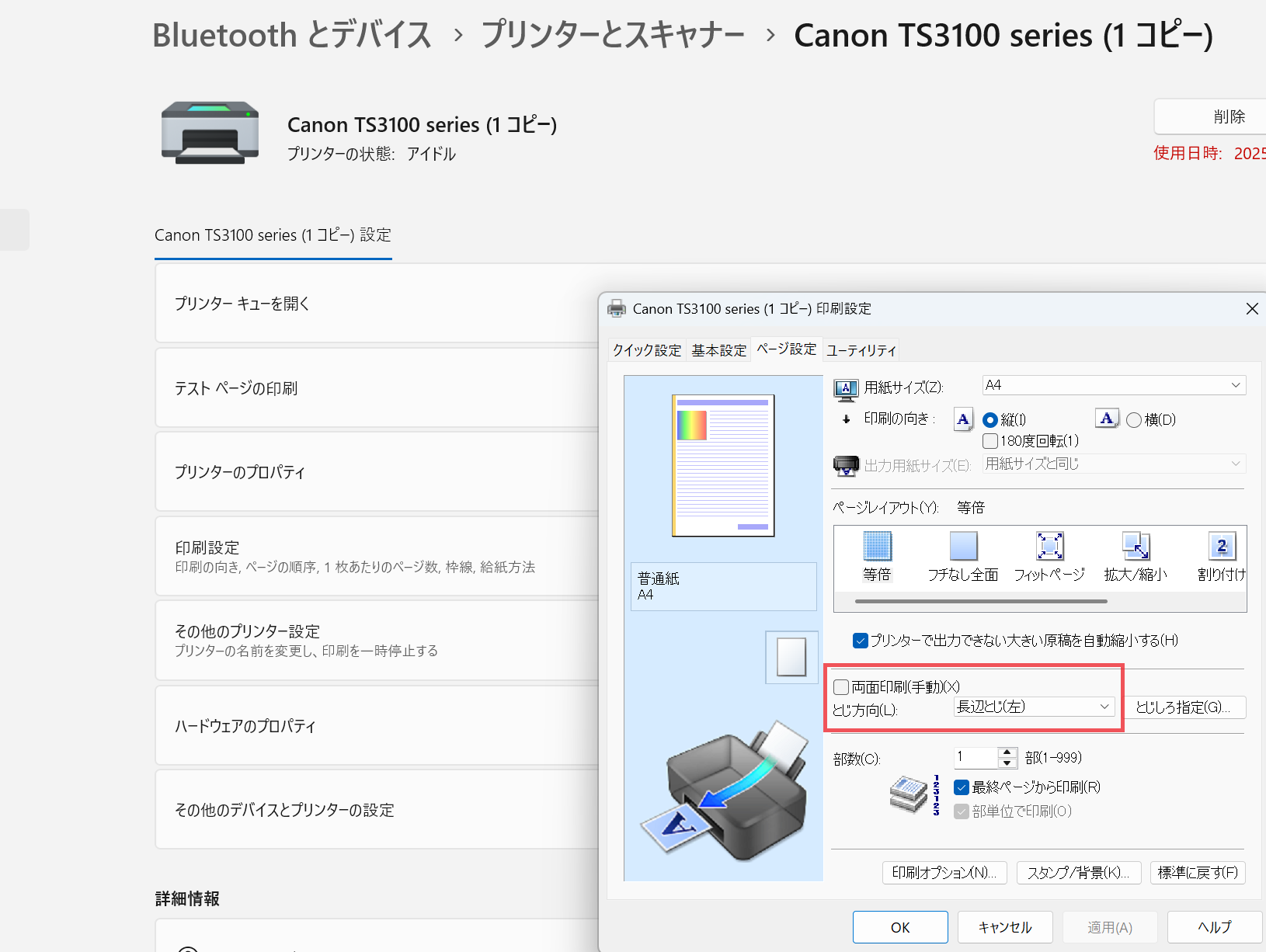 ・プリンタードライバーの設定が両面になっている場合は「プリンターとスキャナー」→「印刷設定」から両面をオフにする