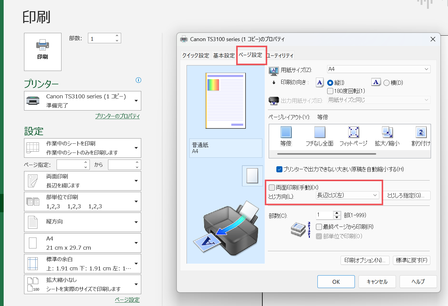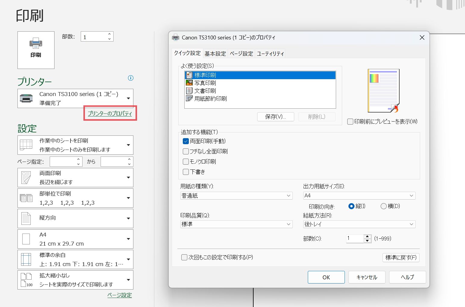 エクセルで片面印刷にならない原因2【プリンタードライバーの設定が両面になっている】