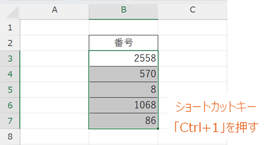 まずは、数字列を範囲選択し、ショートカットキー「Ctrl+1」を押します。