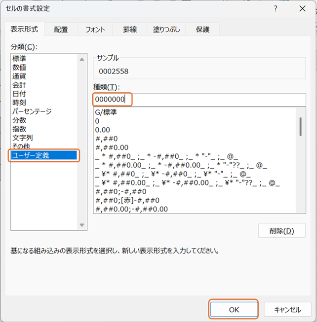 今回は桁数を7桁に揃えるために”0000000″としていますが、「ゼロ」の数を増減させることで任意に桁数を指定できます。
