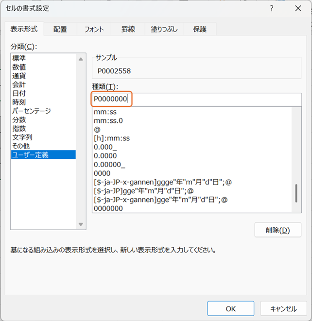 こういったときには、「任意のアルファベット」+「指定したい桁数分のゼロ」を[種類]の欄に入力すればOKです。