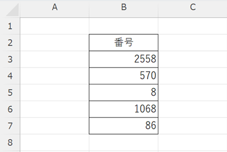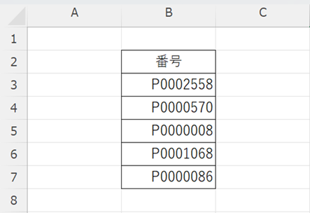 「番号」の列における数字の頭に「ゼロ」を付けることで桁数を7桁に揃えていきます。