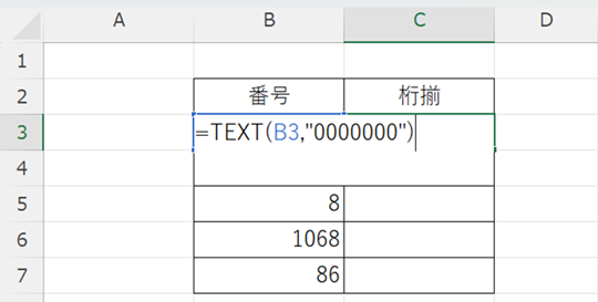 エクセルで桁数を指定(関数で揃える:表示:数式:0を付けて:0埋め)する方法2【TEXT関数で桁数を指定】