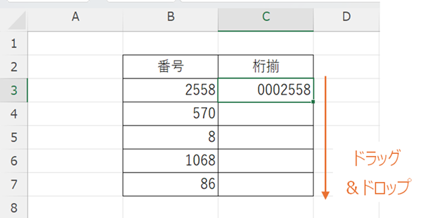 「桁揃」列の先頭に以下のとおり入力し、ドラッグ&ドロップして「番号」列の数字の桁数を揃えていきます。
