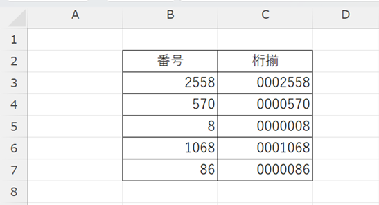 今回は、数字の頭に「ゼロ」をつけることで桁数を7桁に揃えていきます。