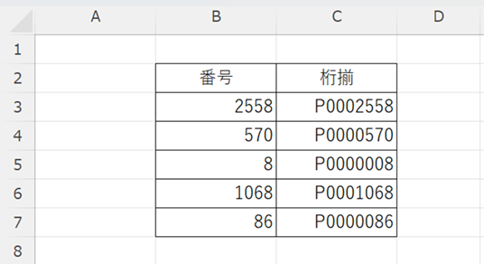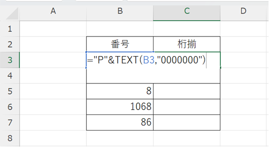 例えば、「P」を頭に付けた7桁の数字に揃えたいときは、以下のとおり数式を入力します。