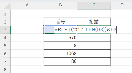なお、今回は7桁に揃えていくので、REPT関数のふたつめの引数の頭に「7」を入力していますが、この数値を任意に指定することで桁数が変えられます。