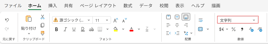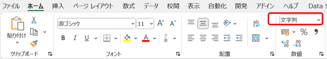 文字列として入力したいセル範囲を選択し、「ホーム」タブのリボン中央にある数値グループのプルダウンから「文字列」を選択します。