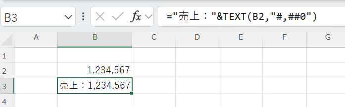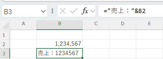 「=”売上:”&B2」と入力しても「売上:1234567」となり、カンマ区切りになりません。