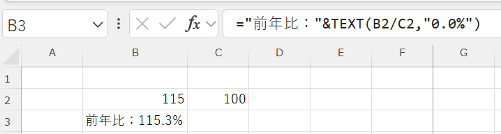 前年比表示の数式:=”前年比:”&TEXT(B2/C2,”0.0%”)