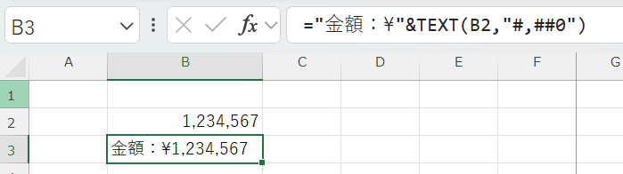 金額表示の数式:=”金額:¥”&TEXT(B2,”#,##0″)