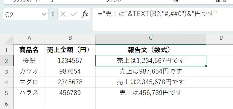 桜餅 1234567 =”売上は”&TEXT(B2,”#,##0″)&”円です”