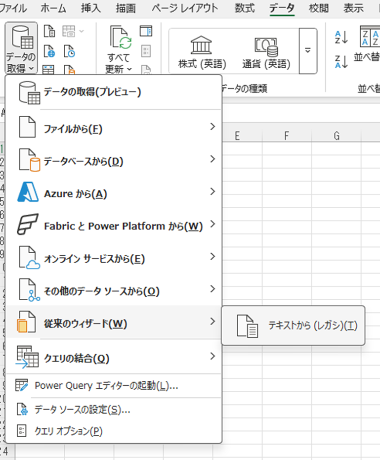 ・レガシーウィザード:「データの取得」→「レガシーウィザードから」→「テキストから(レガシー)」で段階的に取り込み設定