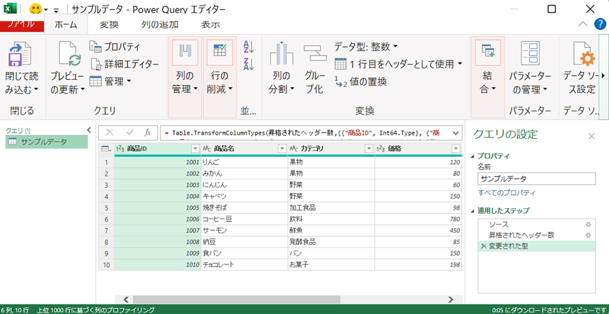 右側には 「適用したステップ」 という欄があり、取得から変換までの操作が自動的に記録されています。