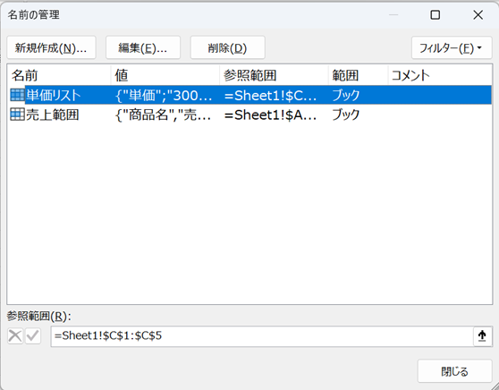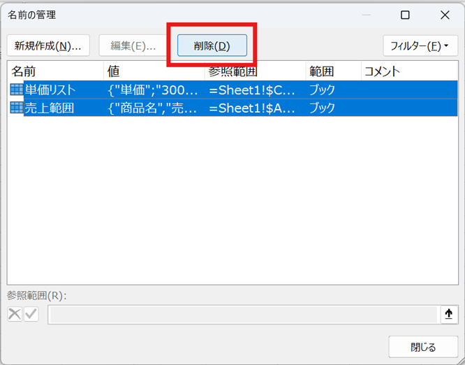 このシートに「売上範囲」「単価リスト」などの名前が定義されており、不要なものを削除したい場合に有効です。