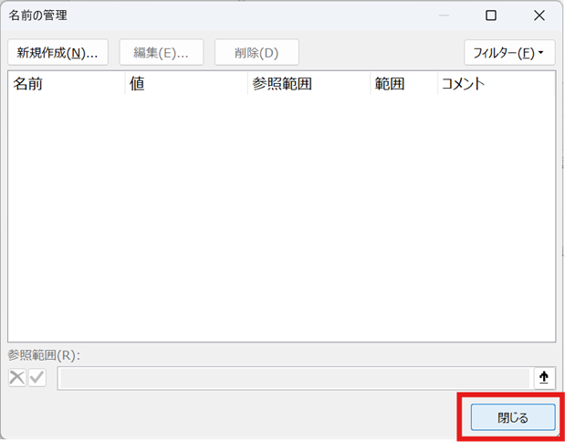 全ての削除が完了したら、「閉じる」ボタンをクリックしてダイアログを閉じてください。名前ボックスのドロップダウンリストを確認すると、削除した名前が表示されなくなっているはずです。