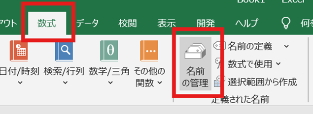 「数式」タブの「定義された名前」グループにある「名前の管理」ボタンをクリックします。