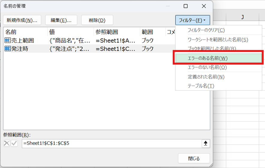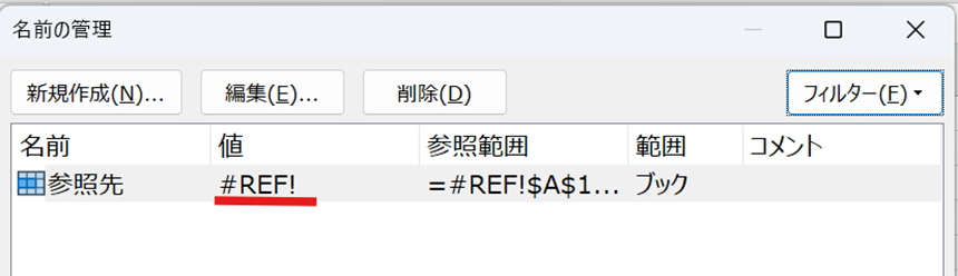 名前の管理ダイアログを開くと、エラーや参照先が不明な名前定義が大量に存在している場合があります。