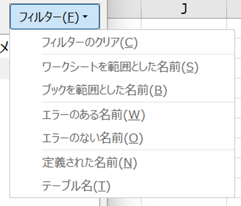 「名前の管理」ダイアログが開いたら、右上にある「フィルター」ボタンをクリックしてください。