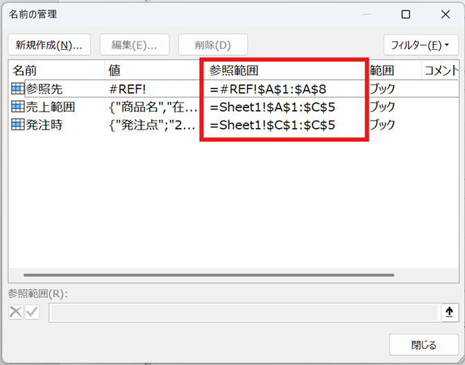 リストには、名前、値(参照先)、参照範囲、スコープ(ブック全体かシート固有か)、コメントなどの情報が表示されるでしょう