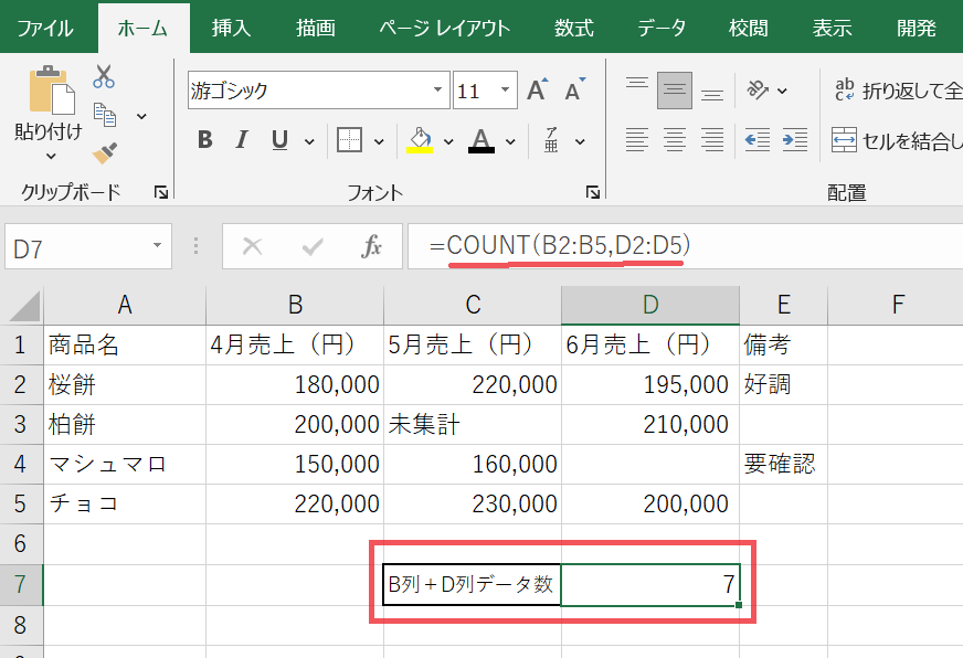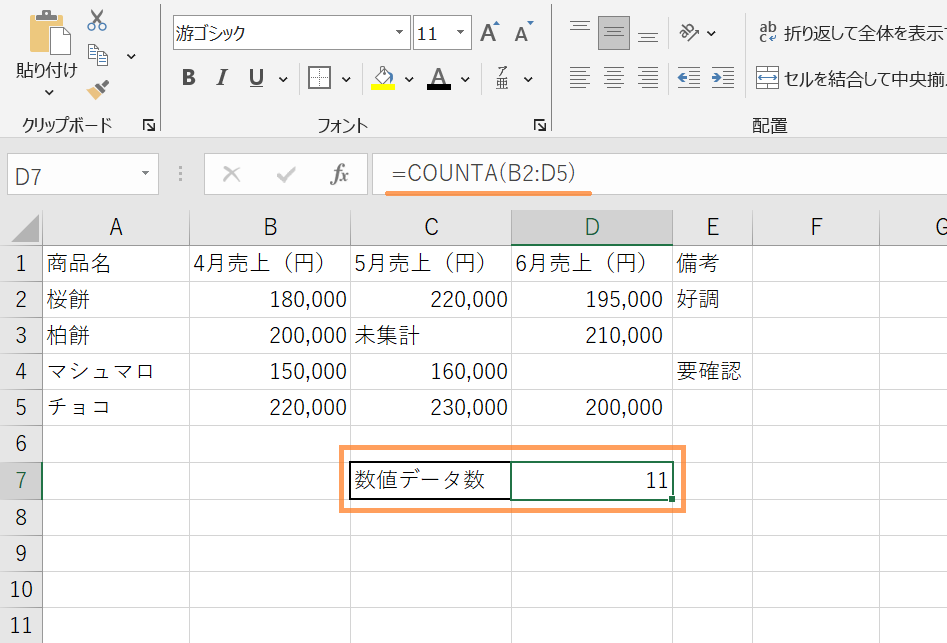 サンプルデータでは「未集計」という文字列が入っているC3セルと空白のD4セルはカウントされないため、結果は「10」になります。