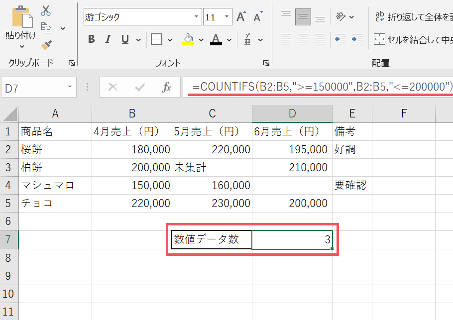 【ポイント】条件付きで数値の個数をカウントするにはCOUNTIF関数を使います。条件は「”>=200000″」のようにダブルクォーテーションで囲んで指定します。複数条件にはCOUNTIFS関数を使いましょう。
