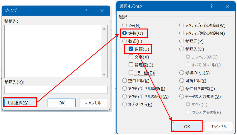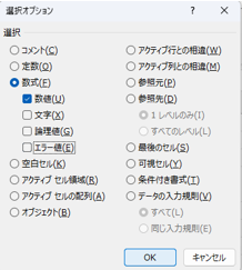 「数値」だけにチェックを入れてOKをクリックすると、数値を返している数式セルだけが選択されます。
