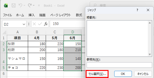 「ジャンプ」ダイアログが開いたら「セル選択」ボタンをクリックします。
