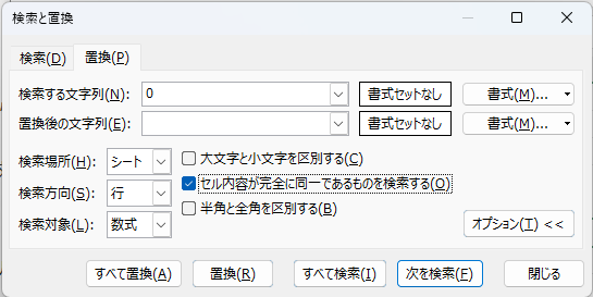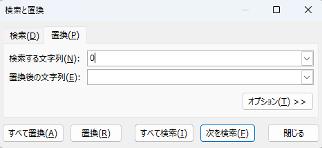 「検索する文字列」に削除したい数値(例:「0」)を入力します。