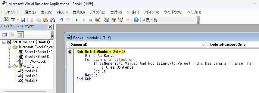 マクロを実行するには数値を削除したい範囲を選択してからVBAエディターで「F5」キーを押すか、マクロダイアログから「DeleteNumbersOnly」を選択して「実行」をクリックします。