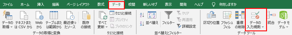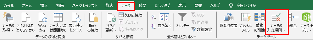 エクセルの入力規則機能は、「データ」タブに配置されています。