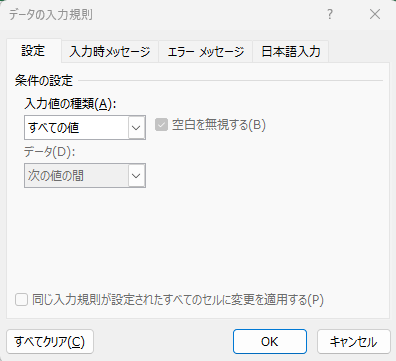 ダイアログボックスには、「設定」「入力時メッセージ」「エラーメッセージ」の3つのタブがあり、それぞれで入力制限の詳細を調整できます。
