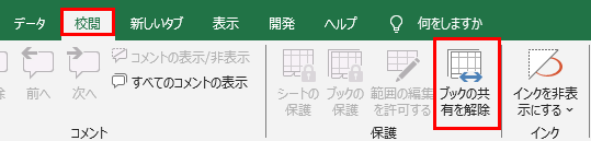 「ブックの共有を解除」ボタンをクリックすると共有が解除されます。