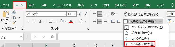 「ホーム」タブ→「配置」グループ→「セルを結合して中央揃え」のドロップダウンから「セル結合の解除」を選択しましょう。