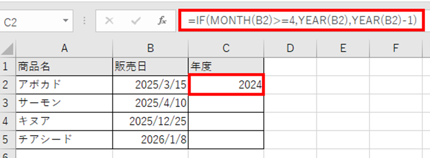 この数式は、B2セルの日付の月が4月以降(4~12月)であれば当年を、3月以前(1~3月)であれば前年を年度として返します。
