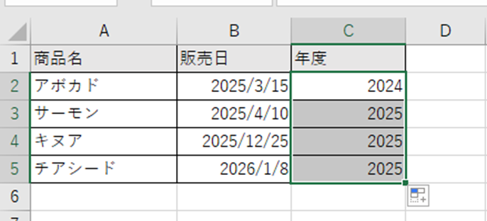 数式をオートフィルでコピーして、すべての行の年度を計算します。