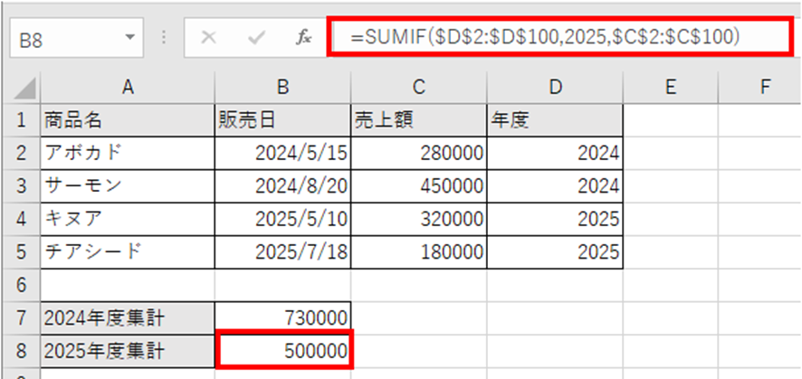 SUMIF関数で年度を条件に売上を集計することで、年度別の合計が計算できるわけです。