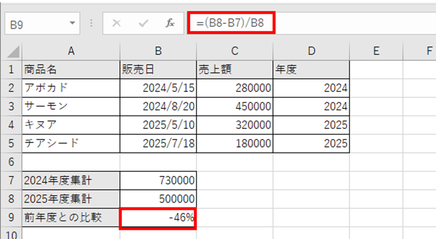 この数式で、2025年度の売上が2024年度と比べて何%増減したかが計算されます。