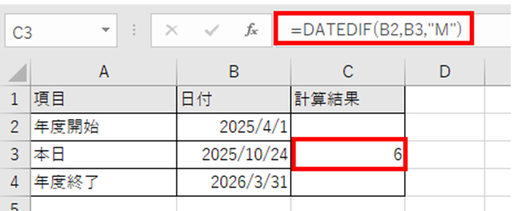 この数式は、2025年4月1日から2025年10月24日までの完全な月数(6ヶ月)を返します。