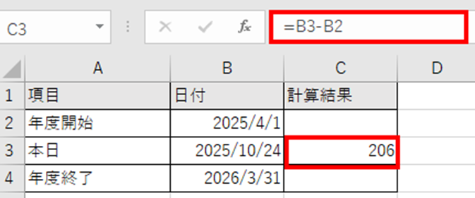 または、単純に日付の引き算でも計算できます。