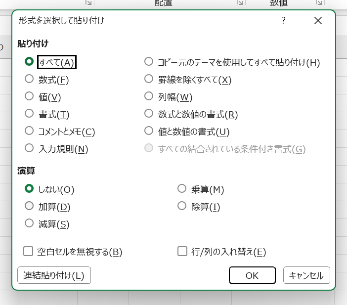「形式を選択して貼り付け」ダイアログでは各オプションの頭文字のキーが割り当てられているため、ダイアログを開いた後は目的のオプションの頭文字を押してEnterキーで確定するパターンを覚えておくと効率的です。